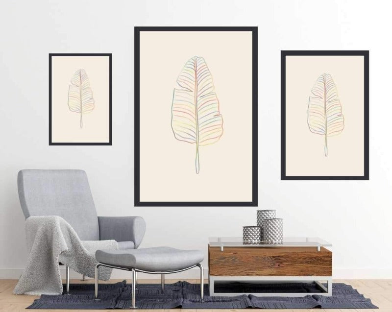 A simple yet elegant line drawing of a banana leaf in various colours of the rainbow fcreating the lines of this leaf and is perfect for any wall.