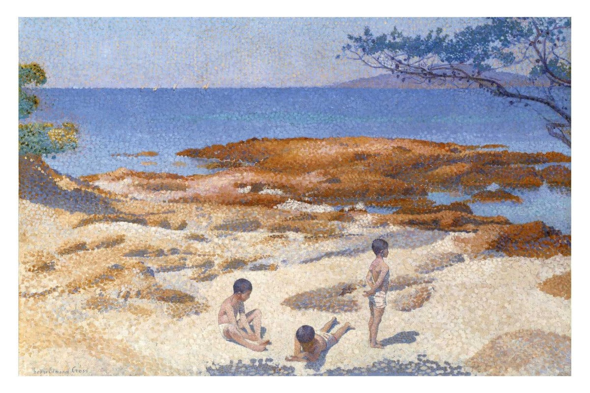 In 1891, as a result of his rheumatoid arthritis, Henri Edmond Cross moved to Cabasson, a hamlet on the Côte d’Azur in southeastern France. The move deeply affected his art: after settling on the Mediterranean coast, he embraced the divided brushwork (small dashes and dots of color) and tonal gradations of “scientific Impressionism.” This methodical technique was a departure from the Impressionists’ more intuitive quick strokes of color to capture fleeting atmospheric conditions. In this beach scene, Cross used this more systematic paint application to convey the color and heat of his adopted region.