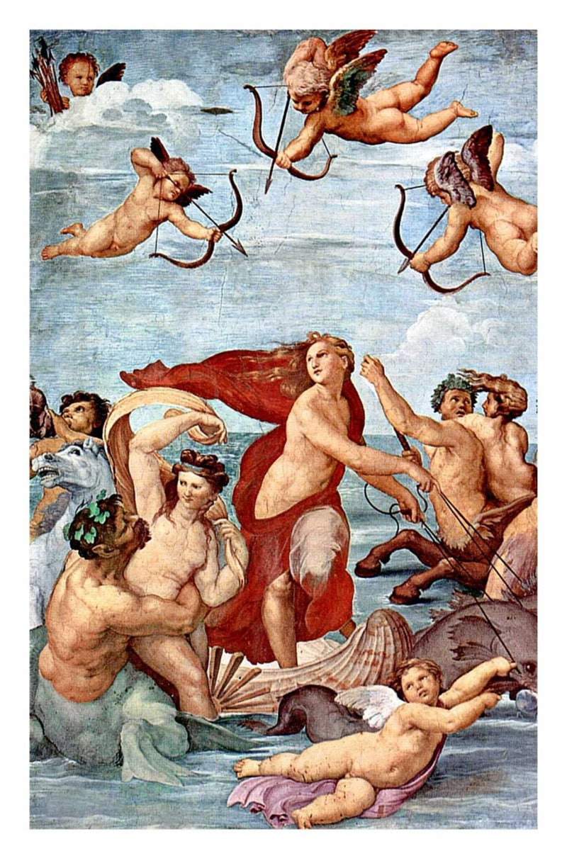 Galatea appears standing on a giant seashell led by two dolphins, surrounded by a company of nymphs and tritons while three putti in the air are drawing their bows.Raphael was commissioned to paint the fresco by his friend, banker Agostino Chini, to display in the Villa Farnesina in Rome. It was inspired by the Greek myth of Acis and Galatea, and took direct inspiration from a poem by Angelo Poliziano, in particular the stanza stating:“Two shapely dolphins pull a chariot: on it sits Galatea and wields the reins; as they swim, they breathe in unison; a mere wanton flock circles one spews forth salt waves, others swim in circles, one seems to cavort and play in love; with her faithful sisters, the fair nymph charmingly laughs at such a crude singer.” Although the fresco is inspired by the tale of Acis and Galatea, Raphael has not chosen a scene that depicts the ill-fated lovers together. Instead, he has portrayed Galatea as she achieves apotheosis, which meant that upon her death she would ascend to join the fully divine beings, as a reward for her patience and endurance of trials and tribulations experienced in her life.