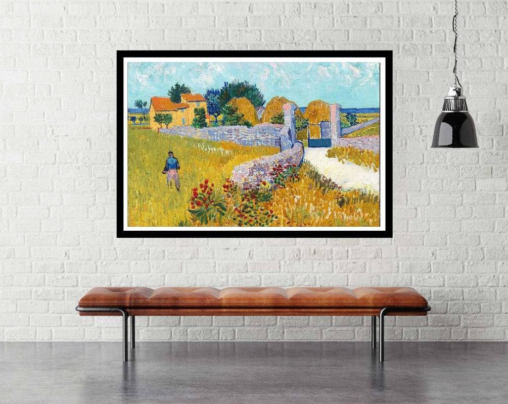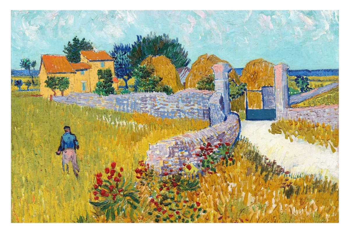 Farmhouse in Provence, also known as Entrance Gate to a Farm with Haystacks, is an oil on canvas painting produced in 1888 by Dutch painter Vincent van Gogh  in Arles, Provence, at the height of his career. Partially due to having been inspired by painter Adophe Monticelli, Van Gogh sought the Provence region of France to further expand his painting skill and experience. Van Gogh used several pairs of complementary colors in the Farmhouse in Provence, the color contrast bringing an intensity to his work. The painting is owned by the National Gallery of Art in Washington, D.C. This amazingly and instantly recognizable work is perfect for a lover of fine art.
