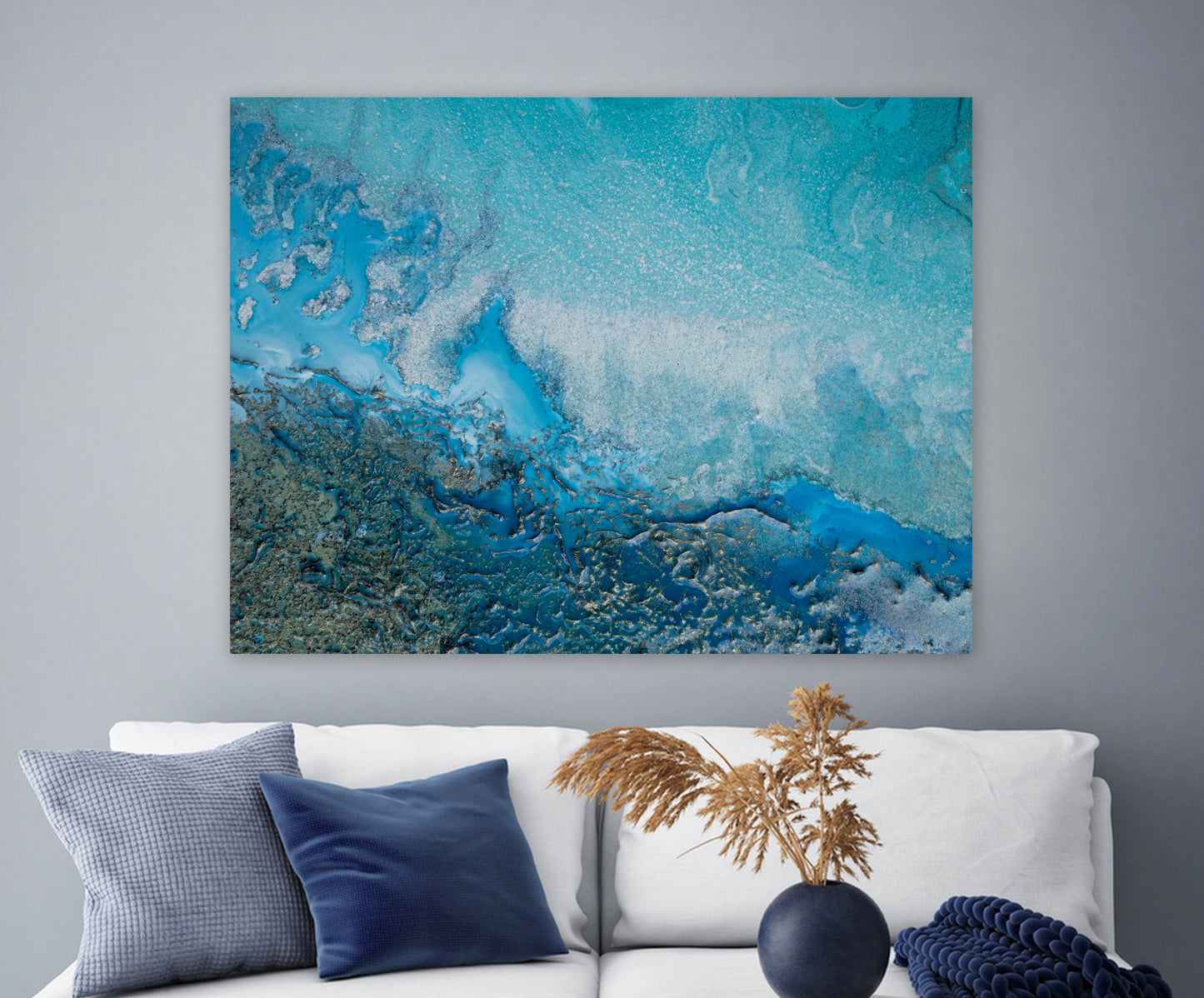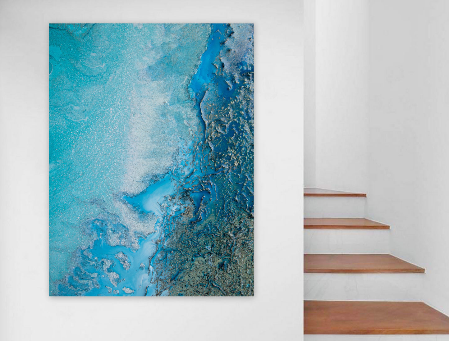 She rarely follows conventional art methods and has developed techniques that creates different effects to closely resemble reef and ocean like formations. The texture is the exposed reef and rocks, the water is the liquid paint, the spray bottle is the force of nature like rain, the hairdryer is the wind, the blowtorch is the sun, the gravity (tilting the board this way and that) is the tide.