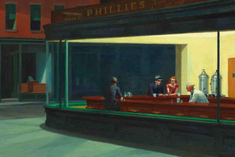 Nighthawks is a 1942 oil on canvas painting by Edward Hopper that portrays people in a downtown diner late at night as viewed through the diner's large glass window. The light coming from the diner illuminates a darkened and deserted urban streetscape.