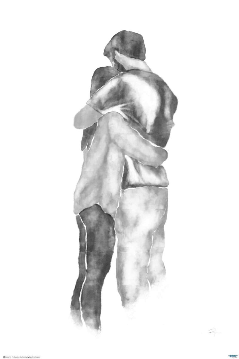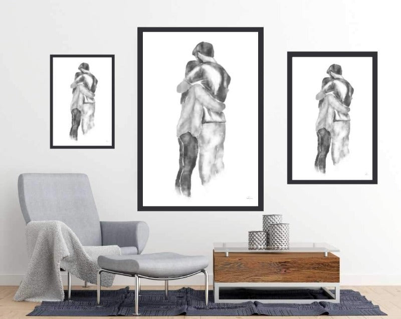 Amazing simplistic black and white watercolour is of a couple embracing. This simple yet elegant piece is perfect for any wall.