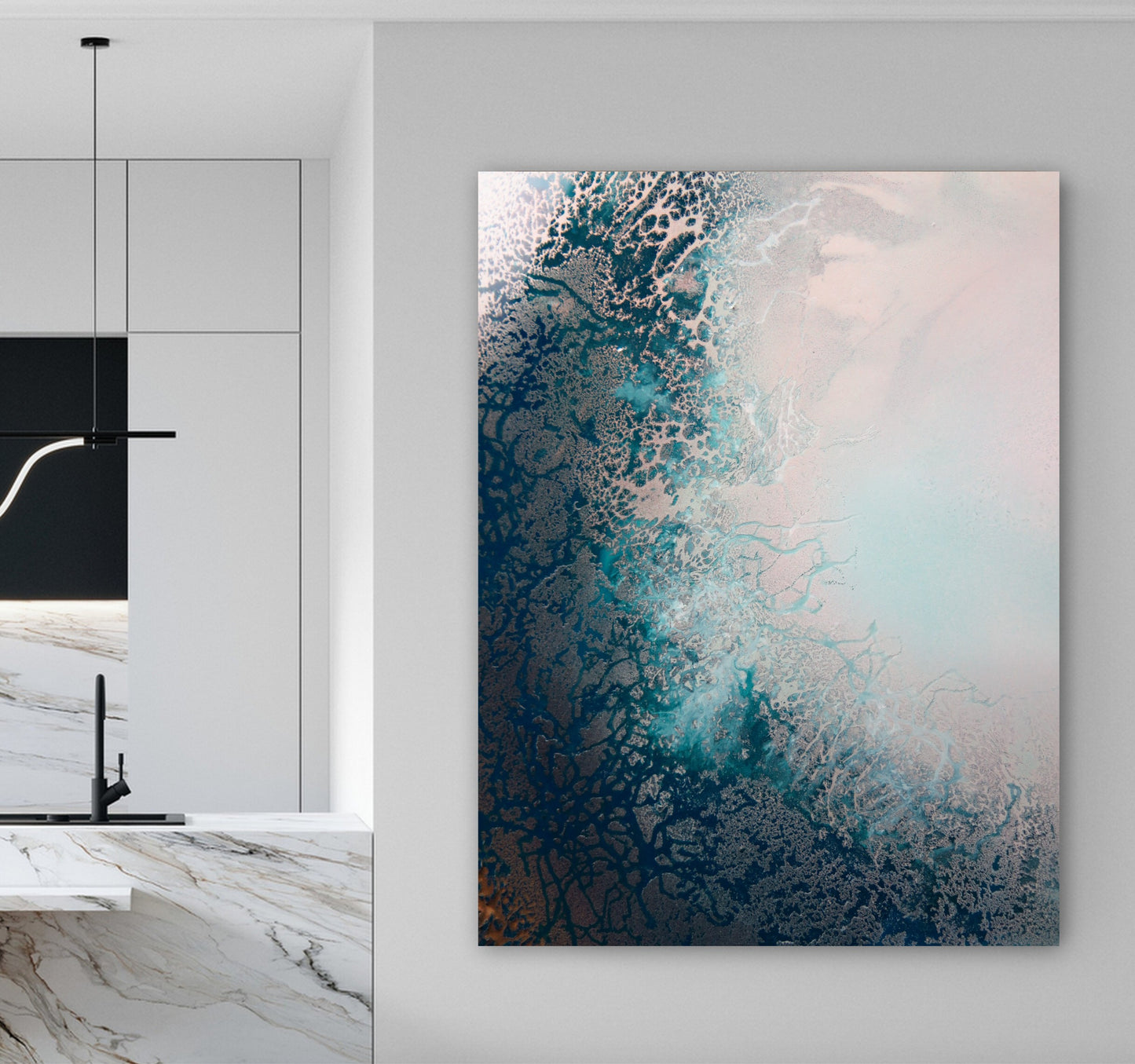 She rarely follows conventional art methods and has developed techniques that creates different effects to closely resemble reef and ocean like formations. The texture is the exposed reef and rocks, the water is the liquid paint, the spray bottle is the force of nature like rain, the hairdryer is the wind, the blowtorch is the sun, the gravity (tilting the board this way and that) is the tide.
