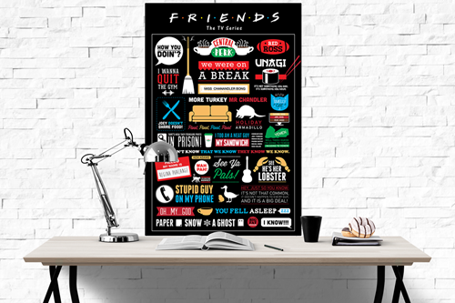 One of the most popular sitcoms to ever grace our screens, Friends has enjoyed immense success since it's debut in 1994. If you followed the ups and downs over the 10 years that is was aired in the lives of Rachel, Monica, Phoebe, Joey, Chandler, and Ross, you are sure to appreciate this fantastic poster crammed full of phrases, quotes and quips featured in the show. From Ross' 'We were on a break' to Joey's 'How you doin', keep the joys of Friends alive and hang this brightly coloured poster on your wall.