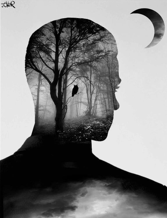 This amazing print showcases one of Jover's amazing pieces, the outline of a man and a moon, with trees and an owl within the outline.