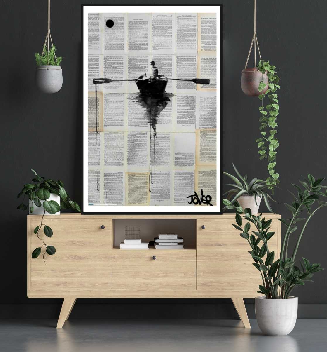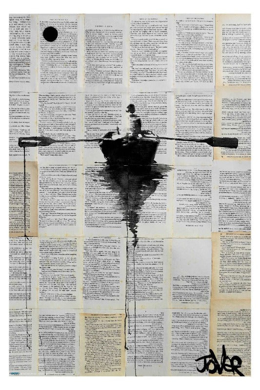 This amazing print showcases one of Jover's amazing pieces, a man rowing with a black moon overhead, entitled Sanctuary 2.