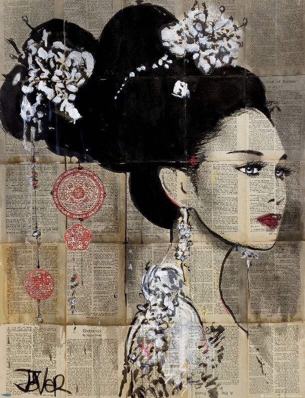 This print showcases one of Jover's amazing portraits, featuring an Asian woman with a pop of colour provided by the red lips and subtle blue eyes.