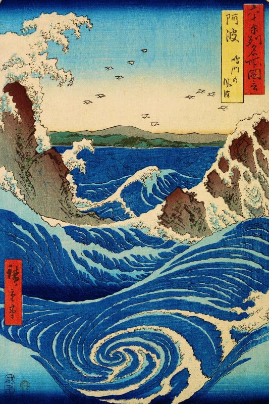 Fierce whirlpools swirl and churn in the seas of Naruto, creating giant waves, as the water is turned and rolled in the currents. Using a traditional technique of wooden block printing, Japanese artist, Hiroshige, has captured the violent nature of this infamous stretch of water with his use of bold colour and strong lines, making this scene one of his most famous masterpieces.