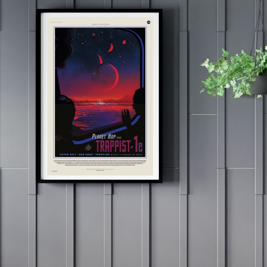 This out of this world travel poster will be helping you have your next interplanetary holiday in no time, pack your bags because its off to Trappist -1e! The perfect poster for travellers and sightseers of the universe!
