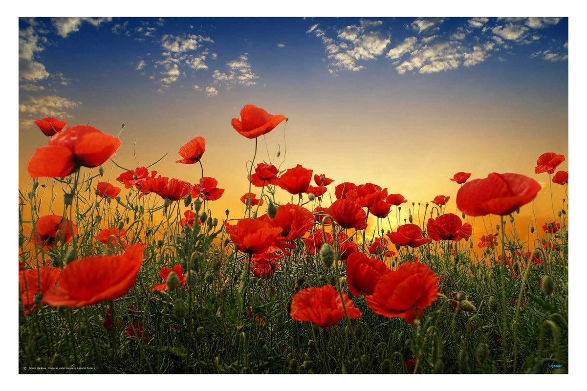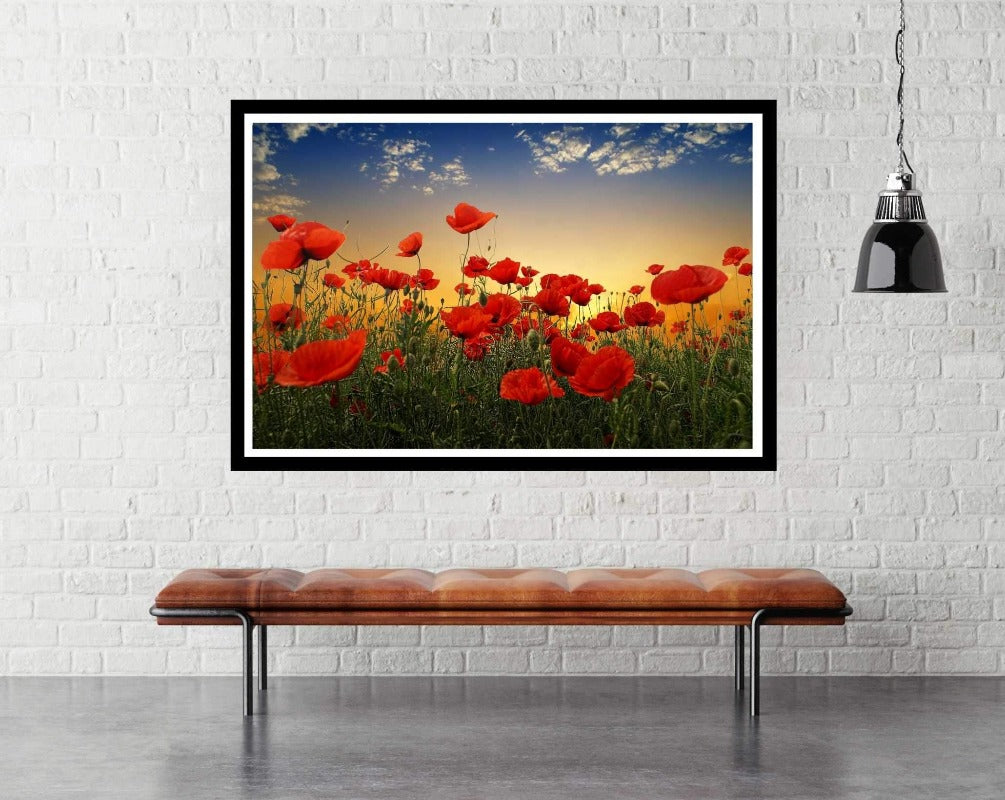 This is vibrant photography poster of a field of poppies with the sun setting in the distance. It is a calming, serene scene that will take your breath away.