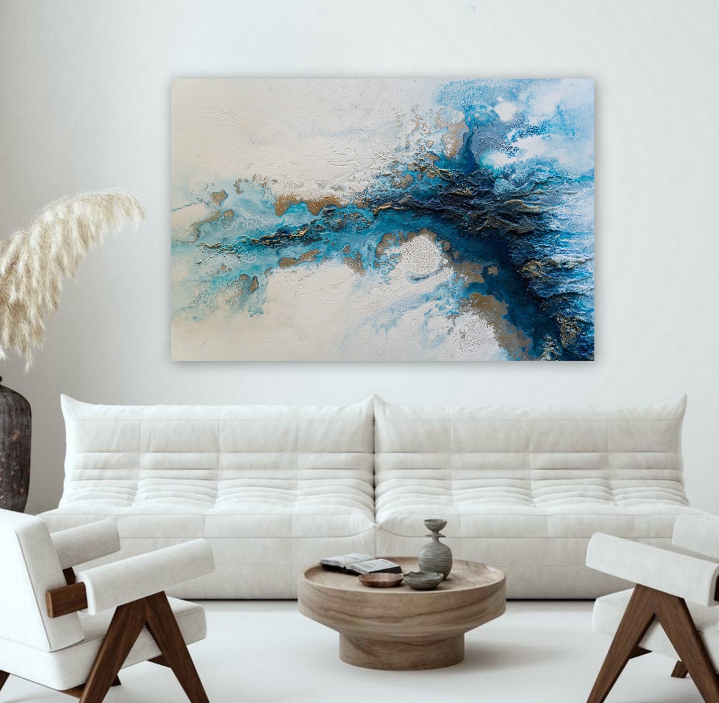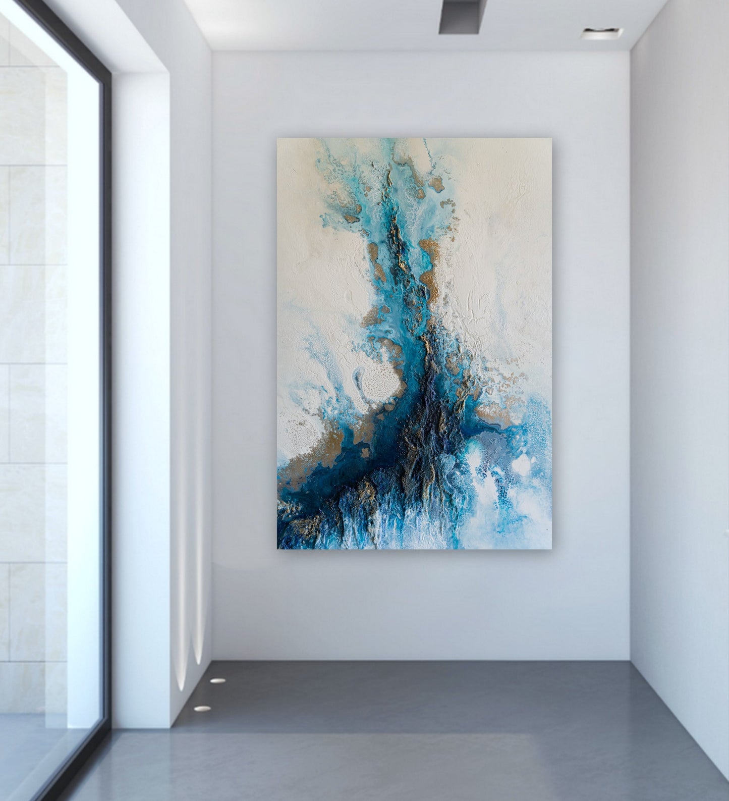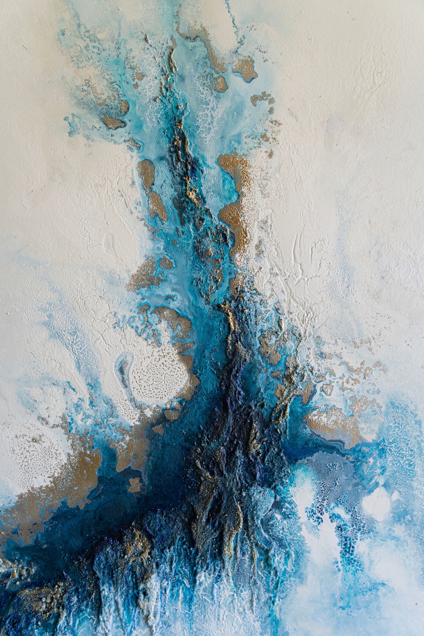 She rarely follows conventional art methods and has developed techniques that creates different effects to closely resemble reef and ocean like formations. The texture is the exposed reef and rocks, the water is the liquid paint, the spray bottle is the force of nature like rain, the hairdryer is the wind, the blowtorch is the sun, the gravity (tilting the board this way and that) is the tide.