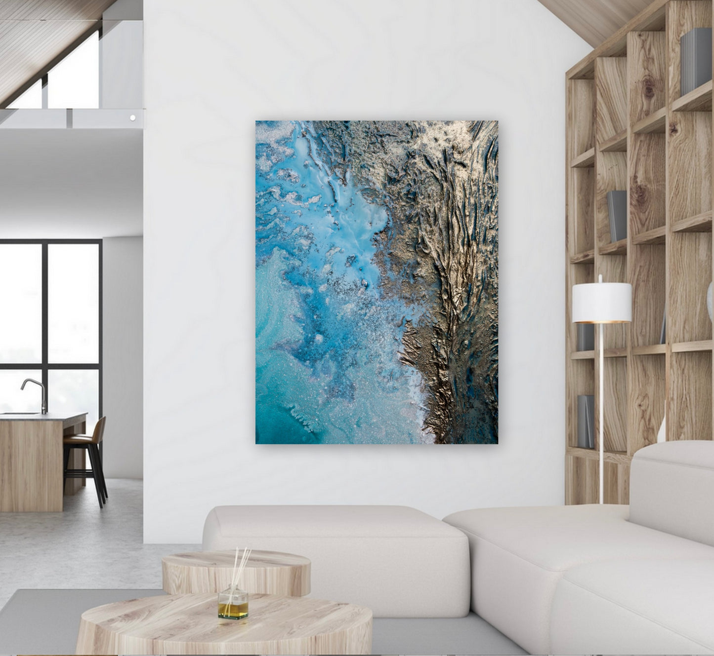 She rarely follows conventional art methods and has developed techniques that creates different effects to closely resemble reef and ocean like formations. The texture is the exposed reef and rocks, the water is the liquid paint, the spray bottle is the force of nature like rain, the hairdryer is the wind, the blowtorch is the sun, the gravity (tilting the board this way and that) is the tide.