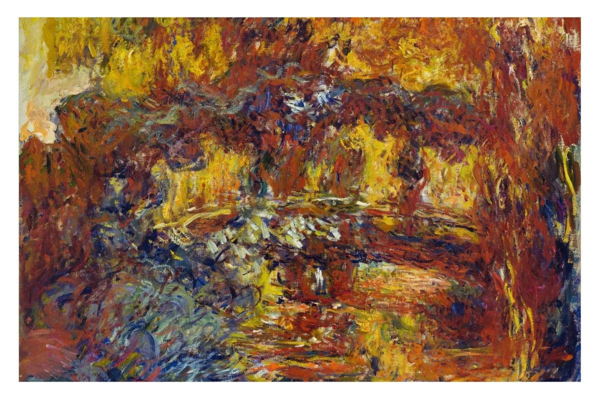 The Japanese Footbridge is among Monet's last paintings of this subject, made between 1920 and 1922. Twenty-five years earlier, in the late 1890s, the footbridge provided the subject of Monet's first series of paintings of his pond at Giverny. While the paintings in the earlier series are more naturalistic in style, the later works feature dense swirls and loose strokes of color that almost obscure the form of the bridge. These later paintings also feature a fiery palette of maroons, rusts, and oranges unique within Monet's body of work.